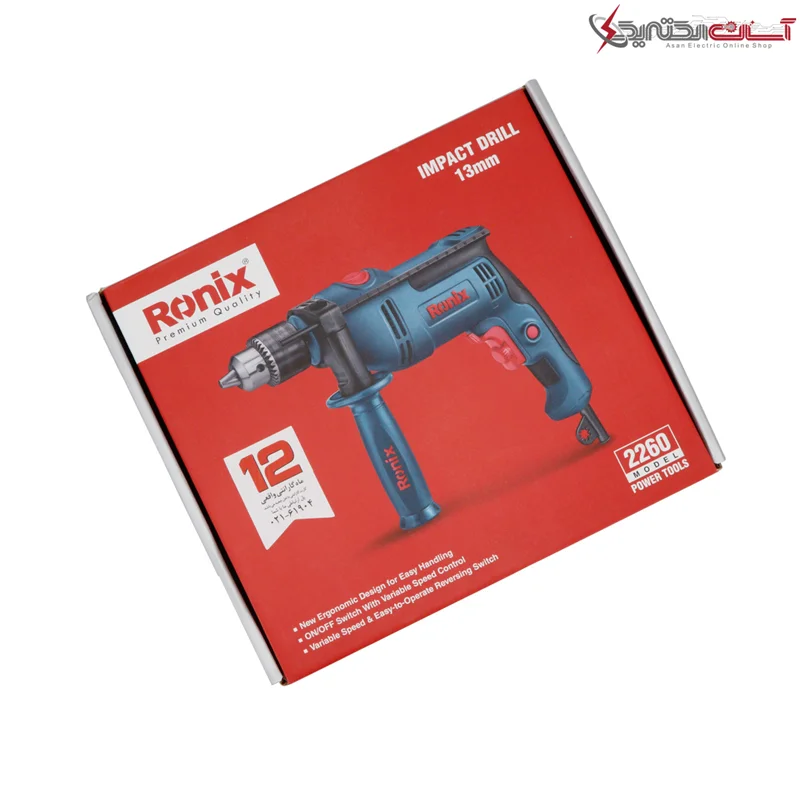 دریل چکشی برقی 2260 رونیکس با ضربات پی در پی و به صورت چکشی، عملیات های سوراخکاری سنگین و تخریب های جزئی را انجام می دهد که همین عملیات چکشی زنی و ضربات مداوم موجب افزایش قدرت نفوذ و افزایش سهولت عملیات سوراخ کاری میشود. این محصول در ابعاد 32x28x12 سانتی متر و با وزن 2 کیلوگرم تولید و همراه با یک میله تنظیم عمق و یک آچار سه نظام روانه بازار میشود.