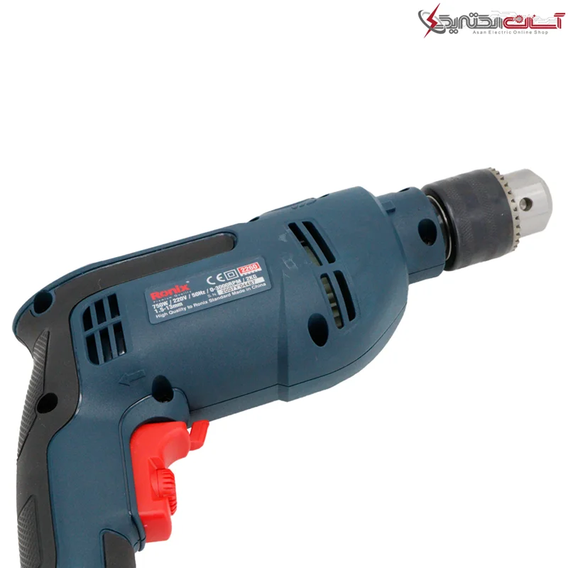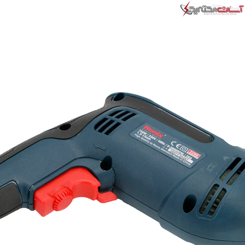 دریل برقی چکشی رونیکس مدل 2260 موتوری با قدرت 750 وات دارد که قادر است سه نظام را با سرعتی بالغ بر 0 تا 3000 دور در دقیقه به حرکت در آورد. تجهیز این محصول با کلید دیمر ضد غبار تنظیم سرعت و قابلیت کنترل سرعت امکان استفاده از این محصول بر سطوح مختلف را به وجود می آورد. با استفاده از دیمری که بر روی کلید پاور تعبیه شده به راحتی میتوان سرعت محصول را کنترل کرد. سه نظام این ابزار برقی از نوع آچاری 13 میلی متری است و برای اتصال و جدا کرن مته نیاز به آچار سه نظام خواهید داشت.