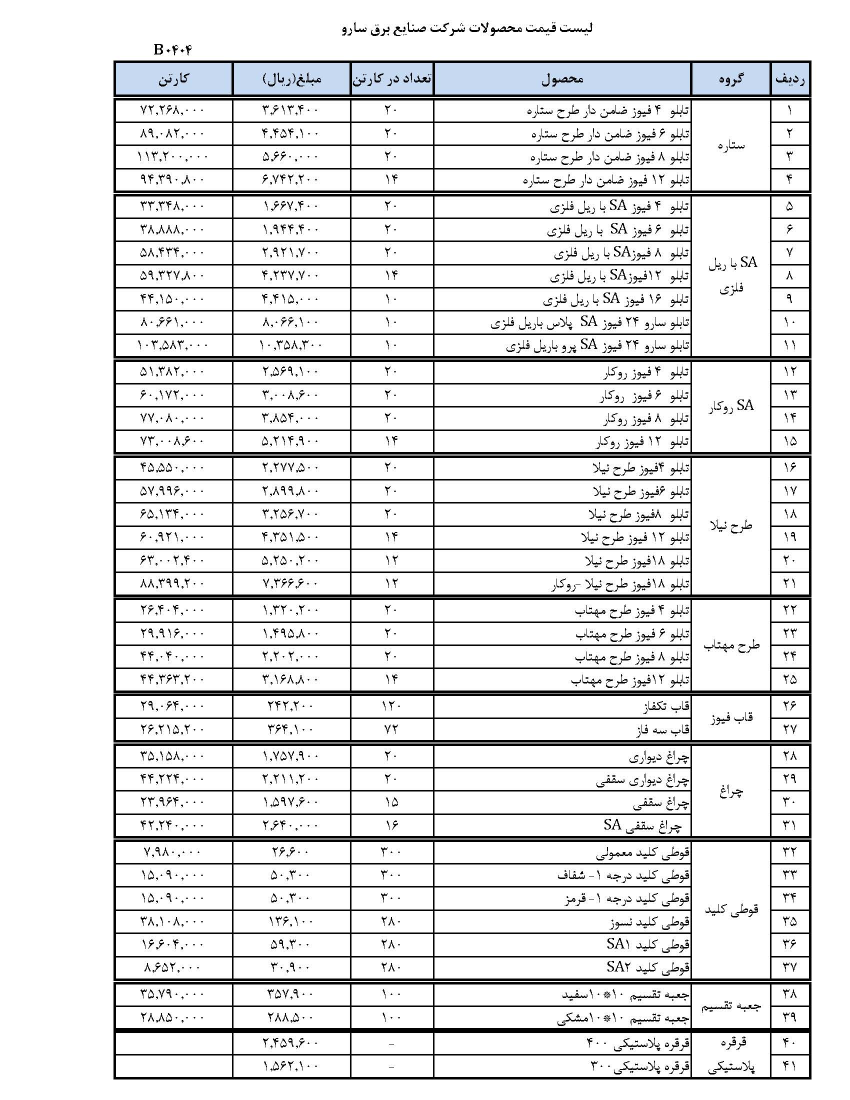 لیست قیمت محصولات برق سارو